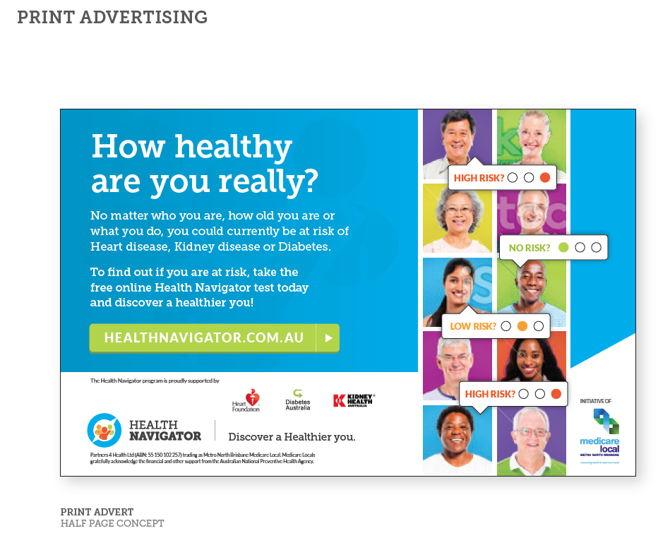 The Primary Objective of this campaign is to develop awareness and drive user engagement of a free, easily accessible and convenient online personal health assessment tool called Health Navigator. The Health Navigator tool will drill through a range of considered questions and statistics to provide a real and accurate self-assessment report with indicators for areas of immediate or long-term concern.