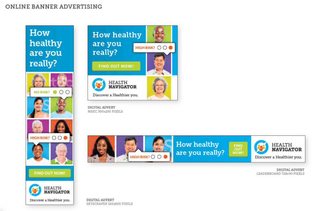 The primary message is clearly presented as are the supportive benefits of finding out how at risk you really are. This Campaign style is flexible enough to hero the Health Navigator tool, while still allow the MNBML brand and partnerships to be included.