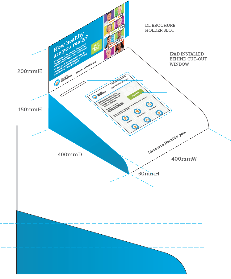 Each unit would contain a hidden iPad (using local Wifi or USB dongle access etc) with the screen accessible via a cut out window. These units ensure that the Health Navigator messaging and brand values remain intact while providing a highly visible, portable and functional touch point.